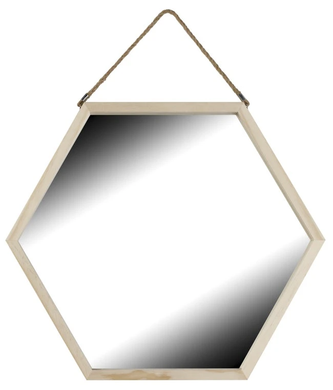 Ce miroir hexagonal apportera originalité et luminosité à votre pièce. On aime les ses lignes géométriques, son coloris naturel et la petite cordelette pour le suspendre.